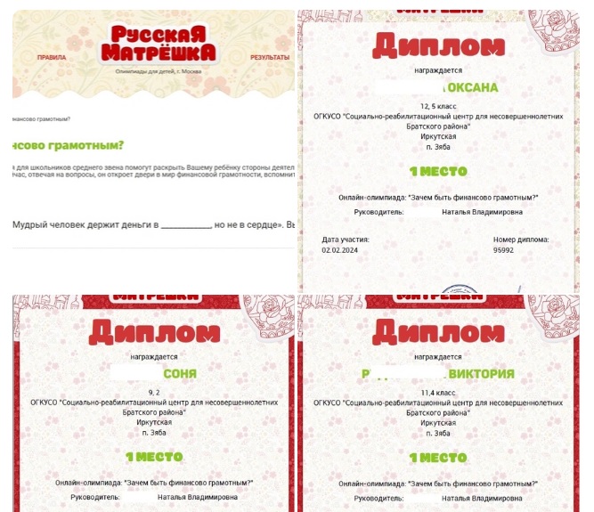 БЫСТРО! ИНТЕРЕСНО! УВЛЕКАТЕЛЬНО! На сайте "Русская матрешка" наши воспитанники с удовольствием участвуют в олимпиаде по финансовой грамотности. Предложенные тестовые задания для школьников среднего звена помогают раскрыть детям стороны деятельности, которые, быть может, не были замечены ранее, но уже сейчас, отвечая на вопросы, они откроют двери в мир финансовой грамотности, вспоминая пословицы и фразы знаменитых классиков.