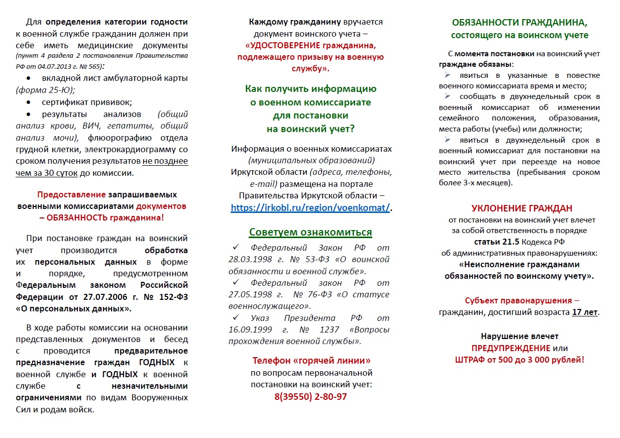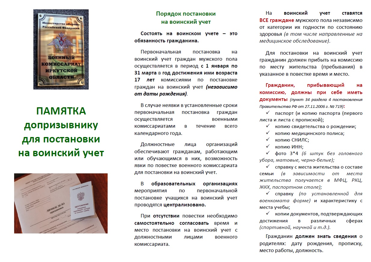 Военным комиссариатом Иркутской области во взаимодействии с отделом по обеспечению деятельности комиссии по делам несовершеннолетних и защите их прав Иркутской области во исполнение пункта 1.6.2 постановления комиссии по делам несовершеннолетних и защите их прав Иркутской области от 27 октября 2022 года № 13-кдн разработана «Памятка допризывнику для постановки на воинский учет».